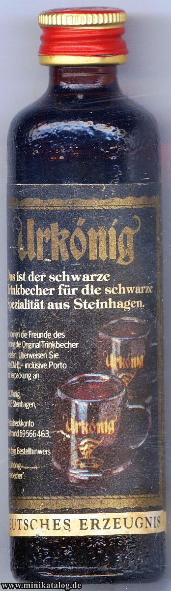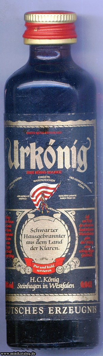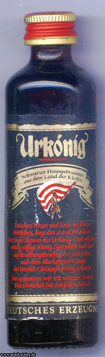20245700 _____Bottle Nr. : 0504499 _Inhalt: Urkönig Menge: 0,04l __ALK: 38% vol INFO.: war nur kurz auf dem Markt wurde wegen FEHLDRUCK der Druckerei wieder eingezogen. MANN mit FAHNE fehlt YEAR / Buying : ______ [PRICE] __KAT1: (X) |