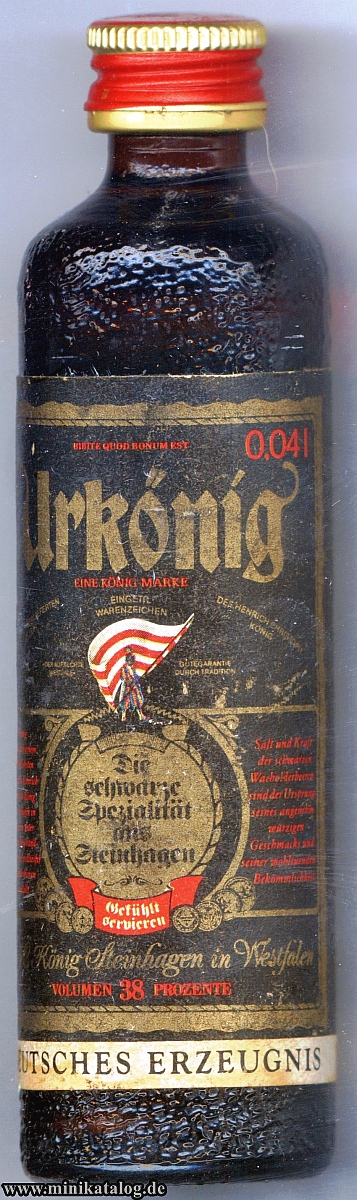 20245700 _____Bottle Nr. : 0504499 _Inhalt: Urkönig Menge: 0,04l __ALK: 38% vol INFO.: war nur kurz auf dem Markt wurde wegen FEHLDRUCK der Druckerei wieder eingezogen. MANN mit FAHNE fehlt YEAR / Buying : ______ [PRICE] __KAT1: (X) |
