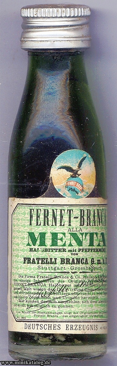 11253850 _____Bottle Nr. : 0201820 _Inhalt: FERNET-BRANCA Menge: [20ml] _ ALK: 45 Vol.% INFO.: INFO.: YEAR / Buying : ______GRÖßE [SIZE] : [PRICE] __KAT1: (S1-X) - (S2-?) |